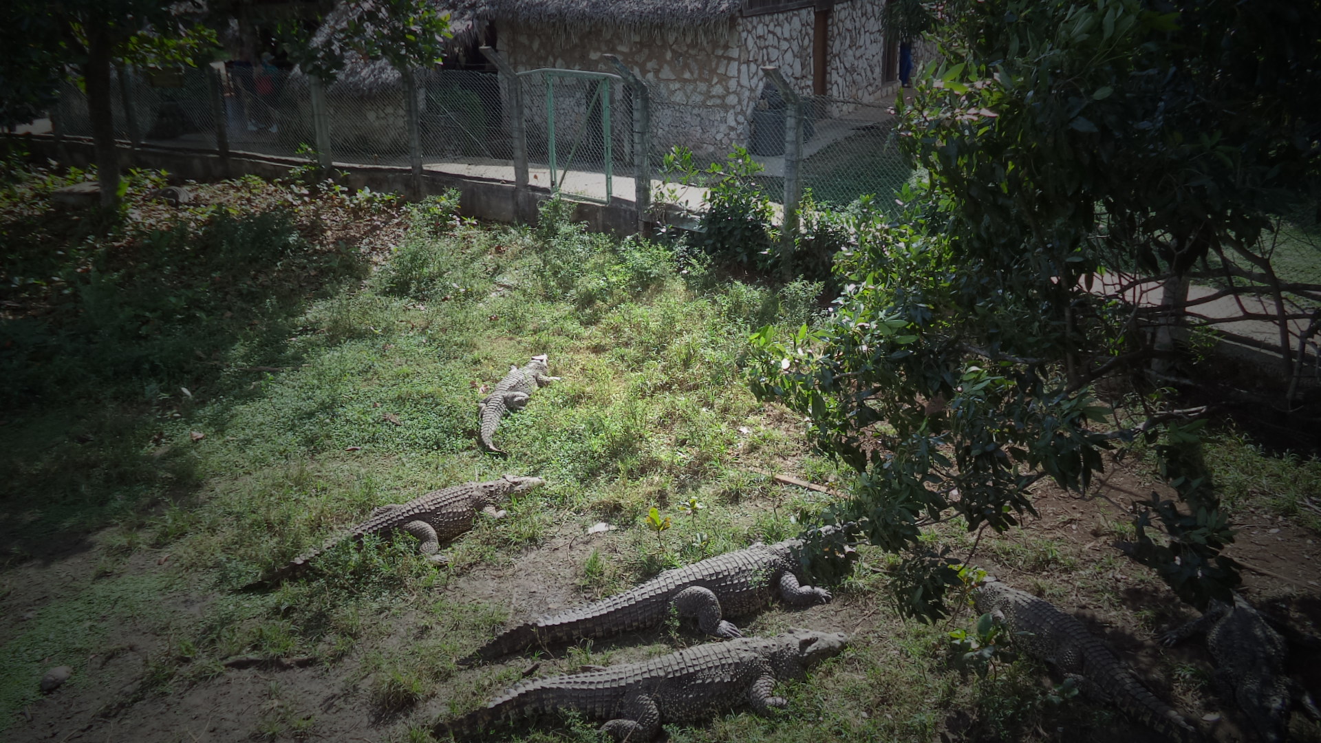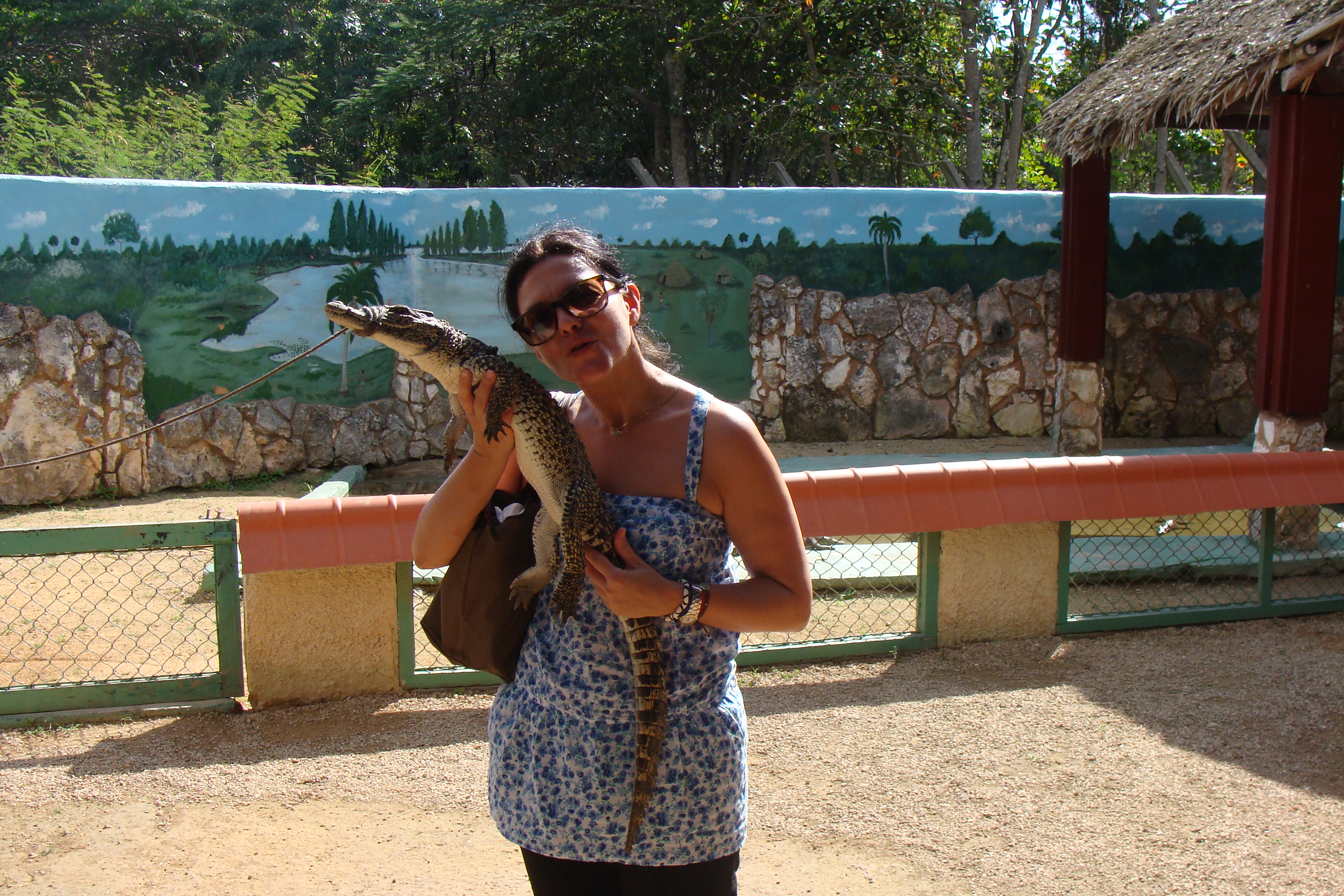 Προχωρώντας στο καταπράσινο πάρκο, κρατικό βέβαια όπως σχεδόν τα πάντα στο νησί, αλλά με “βαριά οικογενειακή” παράδοση (μην ξεχνάμε ότι οι Κουβανοί λατρεύουν τους Έλληνες και τον πολιτισμό τους) συνάντησα μια καλύβα……….μικρά μαγαζάκια με διάφορα σουβενίρ και πράγματα φτιαγμένα από κροκόδειλο, ώσπου έφτασα στην “οικία” των συγγενών του σύντεκνου Σήφη. Τελικά κάλα λένε ότι οι κρητικοί είναι μεγάλα σόγια. Της τρελής γινόταν από Κροκοδειλάκηδες. Και να μιλάνε όλοι μαζί να κάνουν θόρυβο άλλοι να τρώνε κρέας (μεσημέρι γαρ και τους πέτυχα πάνω στο “τραπέζι”)…. Που να με ακούσουν εμένα τώρα που φώναζα για να δώσω τα χαιρετίσματα. Απογοητευμένη, αποφάσισα να ανέβω στη γεφυρούλα που είχε εκεί δίπλα για να τους βλέπω καλύτερα και να πάρω μερικές φωτογραφίες να της δείξω στον ταλαίπωρο τον Σήφη στο Ρέθυμνο άμα τη επιστροφή.