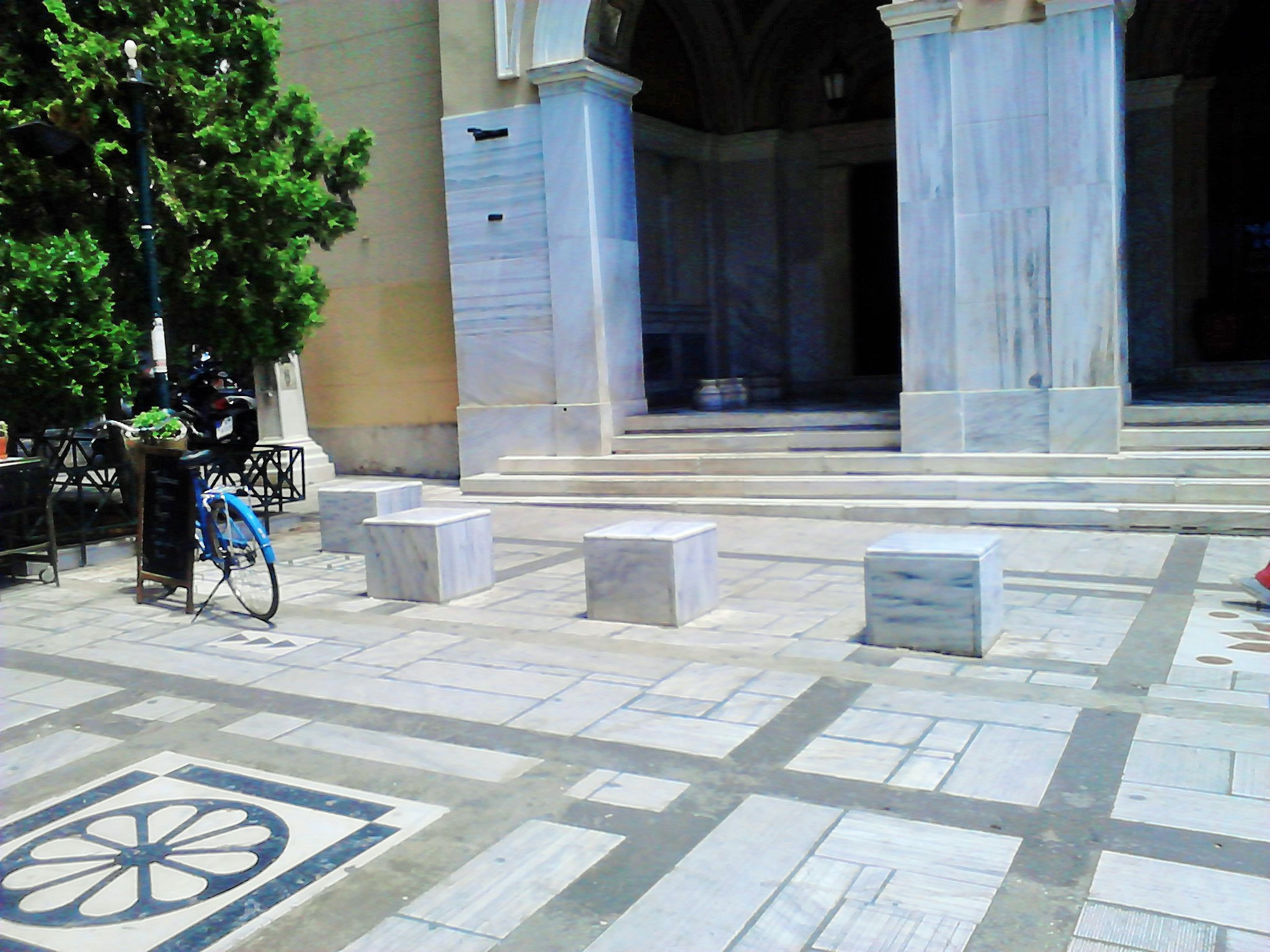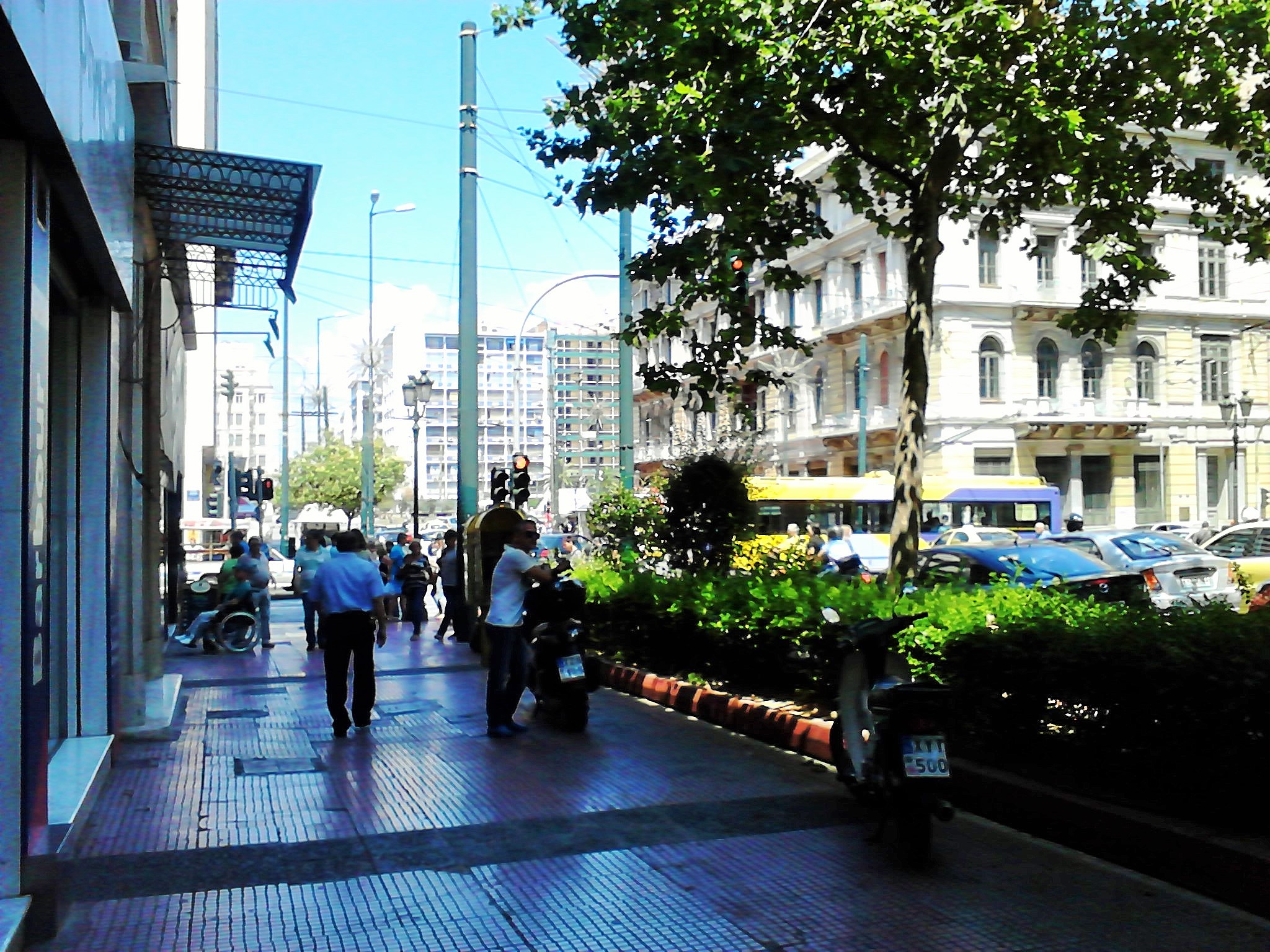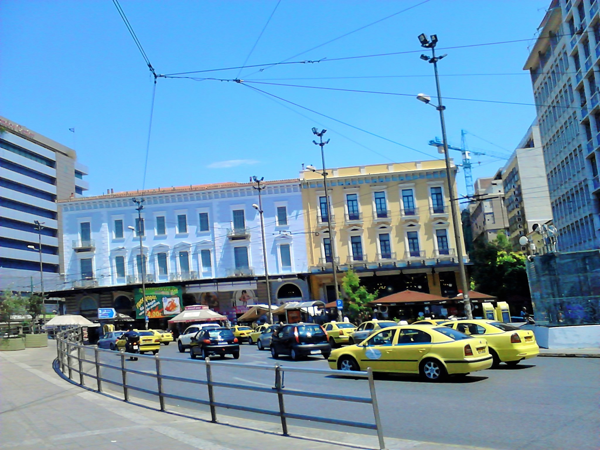 Περπατάμε μερικά βήματα και «πέφτουμε» στην Ομόνοια Πλας. Κάτι τέτοιες στιγμές εύχεται ο άνθρωπος να υπήρχε η «θανατική ποινή» και να έστηναν στα τρία μέτρα αυτόν ή αυτούς που την κατάντησαν έτσι! Πάλι καλά που υπάρχουν γύρω γύρω κάποια εναπομείναντα κλασσικά κτίρια και της δίνουν κάτι από την παλιά της αίγλη (όσο γίνεται). Το καφέ πάνω στην πλατεία το αφήνω ασχολίαστο… Οι μόνοι χαρούμενοι περπατητές πάνω στην τσιμεντο-πλατεία τελικά είναι τα περιστέρια. Την έχουν πέσει σε κάτι κουλούρια και ψίχουλα και δεν δίνουν σημασία σε κάνεναν.