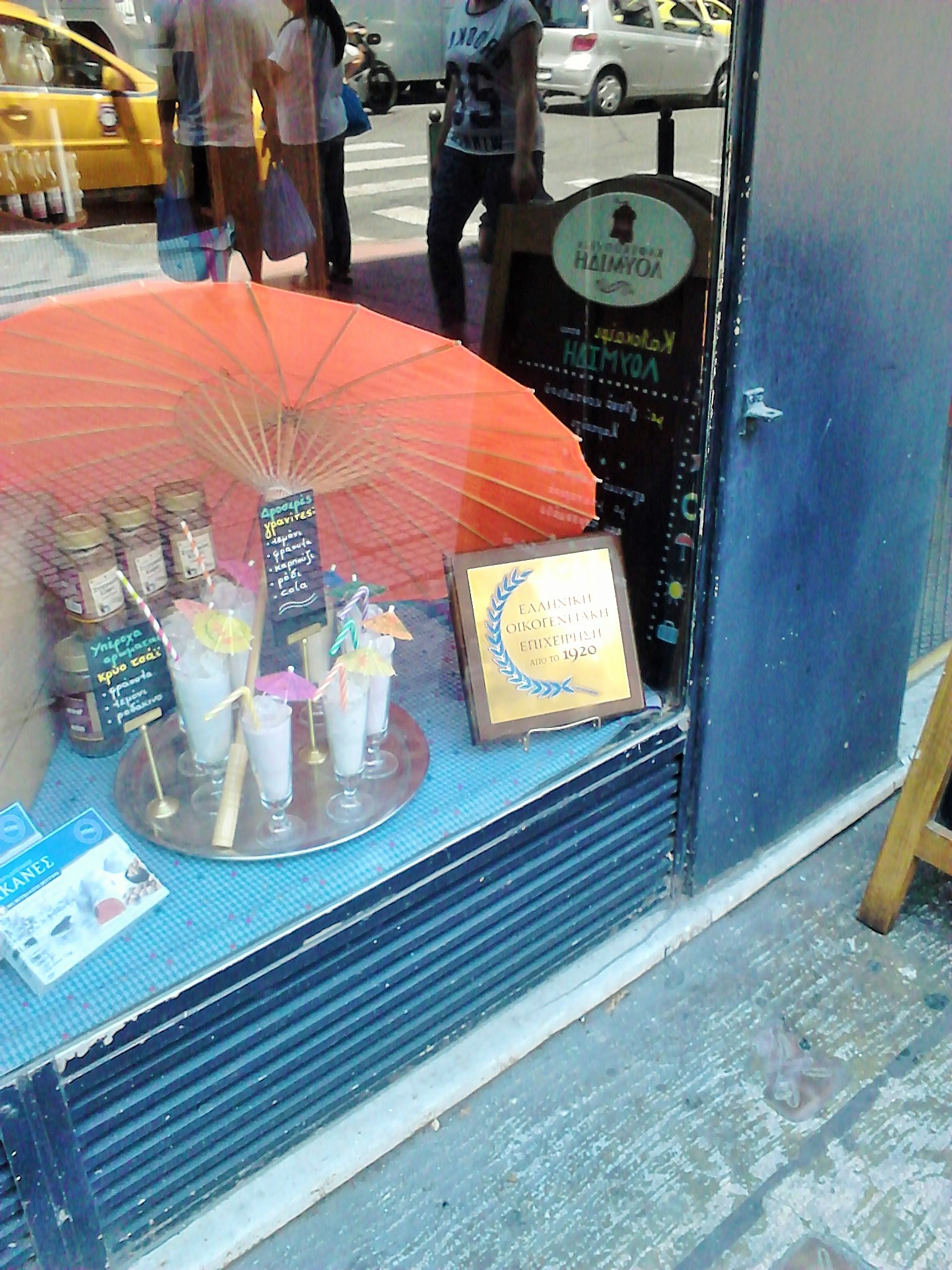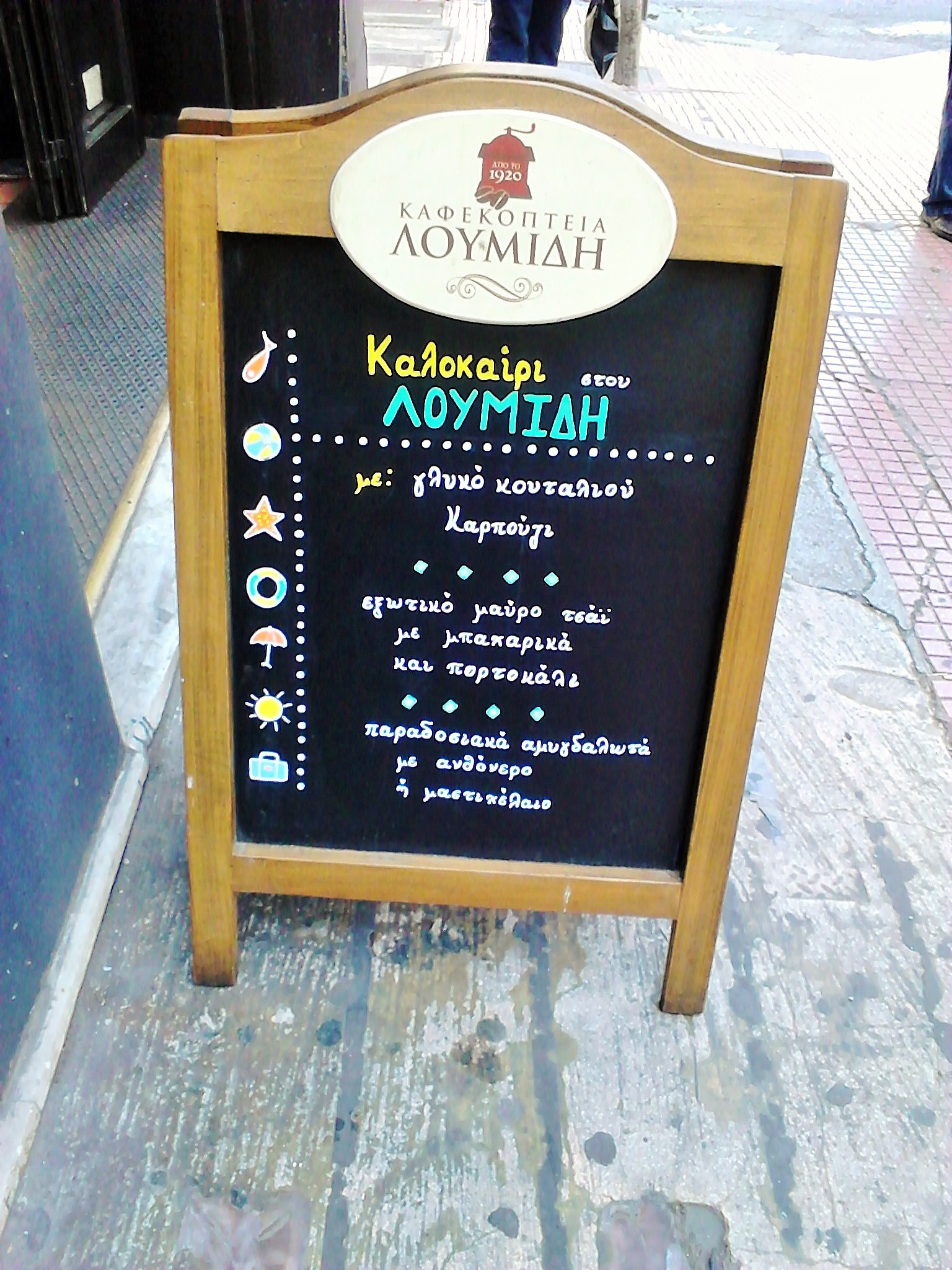 Συνεχίζω να χαζεύω δεξιά και αριστερά. Αισθάνομαι ότι όλα είναι ίδια και ότι όλα έχουν αλλάξει. Είναι σαν να είμαι στην Αθήνα του ΄80 αλλά και στην Αθήνα του 2015. Γωνία με Πατησίων σταματάμε στο φανάρι. Δίπλα μου η βιτρίνα του Λουμίδη. Από το 1920 υπάρχει ο πιό μυρωδάτος καφές. Η βιτρίνα «στολισμένη» καλοκαιρινά σε δροσίζει και μόνο που την βλέπεις – «Καλό καλοκαίρι» γράφει και δίπλα στην πόρτα σου παραθέτει μια γλυκιά πινακίδα με «γλυκό του κουταλιού καρπούζι, ερωτικό μαύρο τσάι με μπαχαρικά και πορτοκάλι και παραδοσιακά αμυδγαλωτά με ανθόνερο κ μαστιχέλαιο». Ενας μαυροπίνακας που σε μεταφέρει αυτόματα σε μια παραλία, ένα σούρουπο, σε μια ξαπλώστρα με ένα καπέλο (δεν ξέρω πως μου ήρθε το καπελο στο μυαλό αλλά είναι απαραίτητο συστατικό της εικόνας).