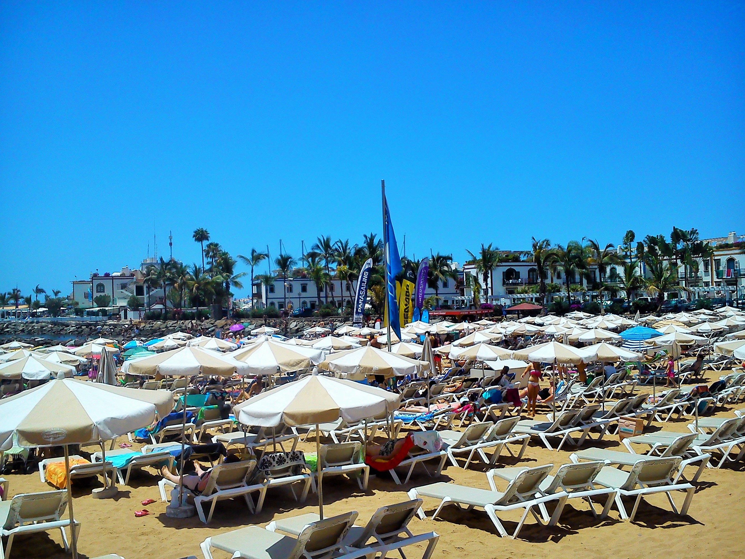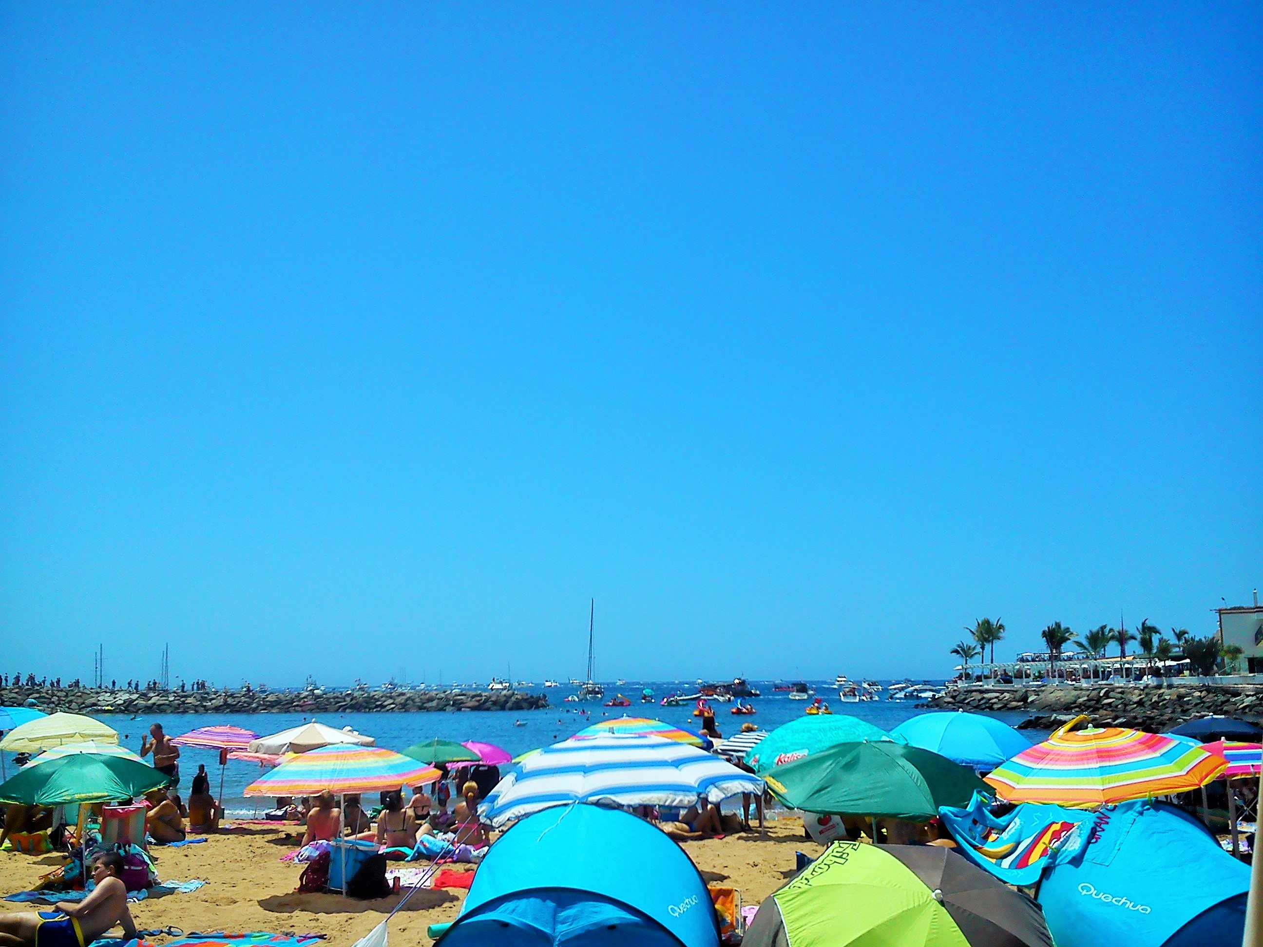 Η παραλία είχε γεμίσει από τυπικές ισπανικές οικογένειες με ομπρέλλες, κουβαδάκια, παιδάκια, μωράκια, μαμάδες, φωνές, μπαμπάδες να πηγαινοέρχονται με μπύρες, κυρίες να φωνάζουν απο δω και απο κει, σωσίβια απο δω και απο κει και μια μικρή παραλία να «βλέπει» τους λουόμενους να κρέμονται από τους φοίνικες σαν τσαμπιά.