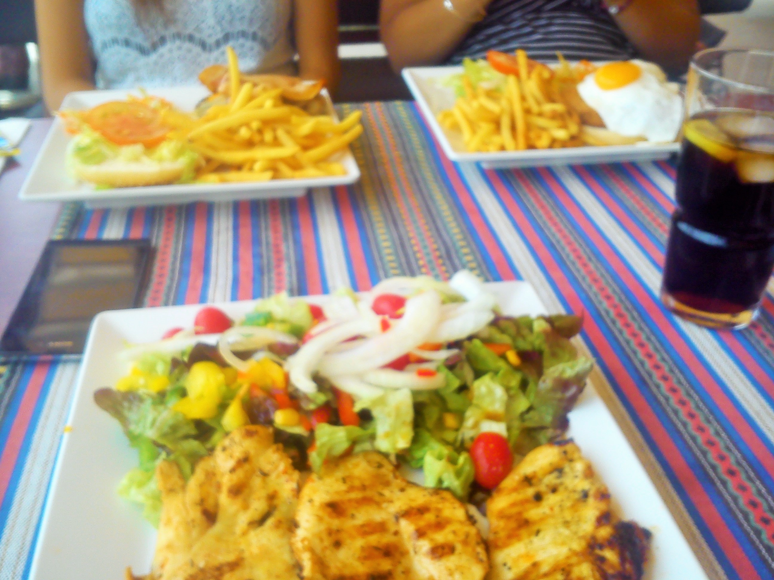 Αφού απλώσαμε και εμείς τις πετσετούλες μας πάνω στις κίτρινες ξαπλώστρες και κάτω από τις κιτρινομπλέ ομπρέλλες, πασαλειφθήκαμε με κρέμες και λάδια, βάλαμε τα καπέλα και ξαπλώσαμε να γίνουμε κάτι μεταξύ αστακού και κάρβουνου. Μπες-βγες-ξάπλωσε-ψήσου-ξαναμπες-ξαναβγες-ξαναξάπλωσε-ξαναψήσου. Αυτή η δουλειά επαναλήφθηκε για τουλάχιστον ενα τρίωρο. Αφού ψηθήκαμε όπως έπρεπε και από τις δύο πλευρές, αισθανθήκαμε κάποιες στομαχικές ανησυχίες. Βάλαμε τις σαγιονάρες μας και κατευθυνθήκαμε στο κοντινό μαγαζάκι να τσιμπήσουμε μερικά τάπας, σαλατίτσες και να πιούμε δροσιστικούς χυμούς ανανά.