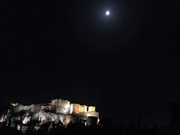Αυτή τη στιγμή που γράφω αυτό το λογοτεχνικό αριστούργημα (πάει για Νόμπελ, τώρα που έκανε την αρχή ο Ντύλαν, τρέμε λογοτεχνία), είμαι αραχτή σαν το βόα στον αναπαυτικό καναπέ του σαλονιού της Βίλλας Ανθέων, μασουλώντας μια φρυγανιά και θαυμάζοντας την υπέροχη φωτογραφία της χθεσινής πανσελήνου στην Ακρόπολη τραβηγμένη από μια εξαιρετική νεαρή “φωτογράφο”!