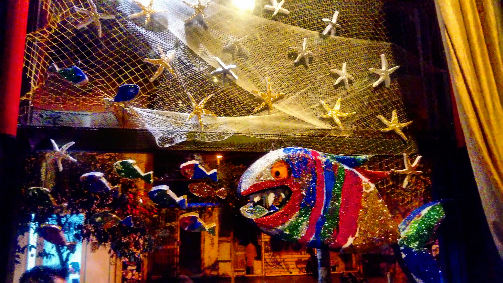 Γέλια, ξανά γέλια, αποφασίζουμε να πληρώσουμε και να φύγουμε. Πηγαίνοντας προς την έξοδο, βλέπω τη διακόσμηση στο τζάμι δίπλα στην πόρτα. Ένα εντελώς καλοκαιρινό φόντο που δένει τέλεια με το υπόλοιπο κονσεπτ αλλά και με τη Χριστουγεννιάτικη μέρα. Κάποιες εικόνες “δένουν” απίστευτα ωραία, σε όποιο σκηνικό.