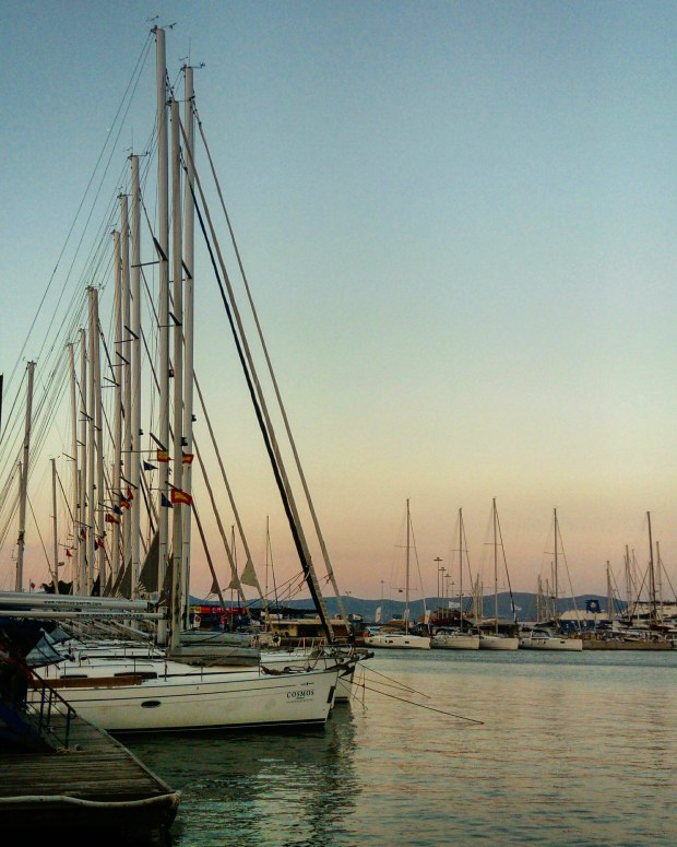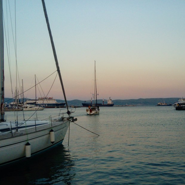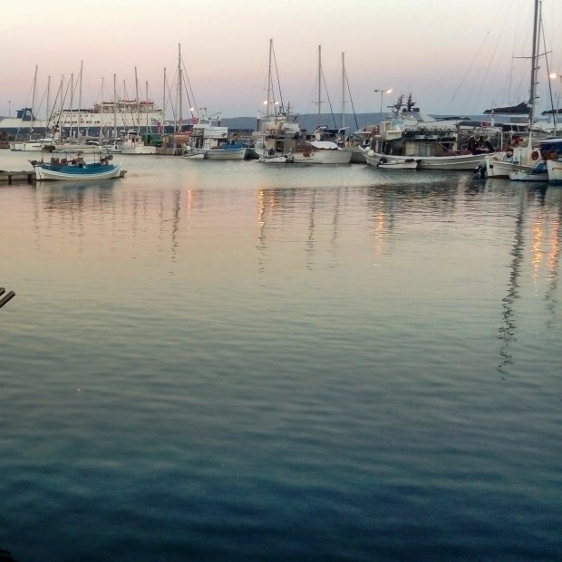 Η βραδυνή θάλασσα λούζεται στα φώτα που πέφτουν πάνω της από τα γύρω ταβερνάκια. Είναι τόσο ήσυχη, λάδι. Στο λιμανάκι, αραδιασμένες πολύχρωμες βάρκες, καϊκια και κάποια κοτεράκια.