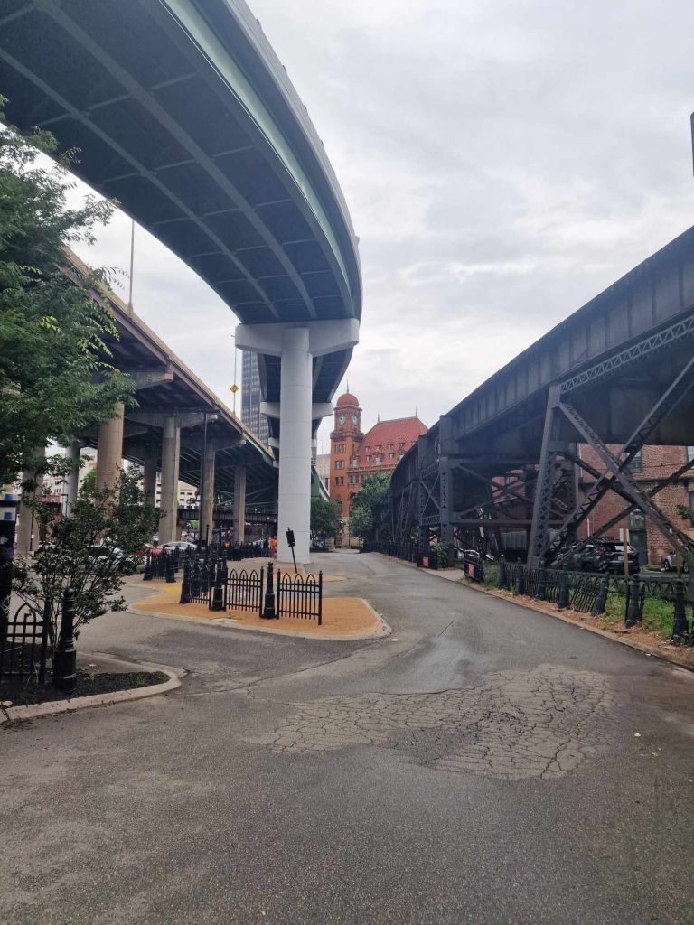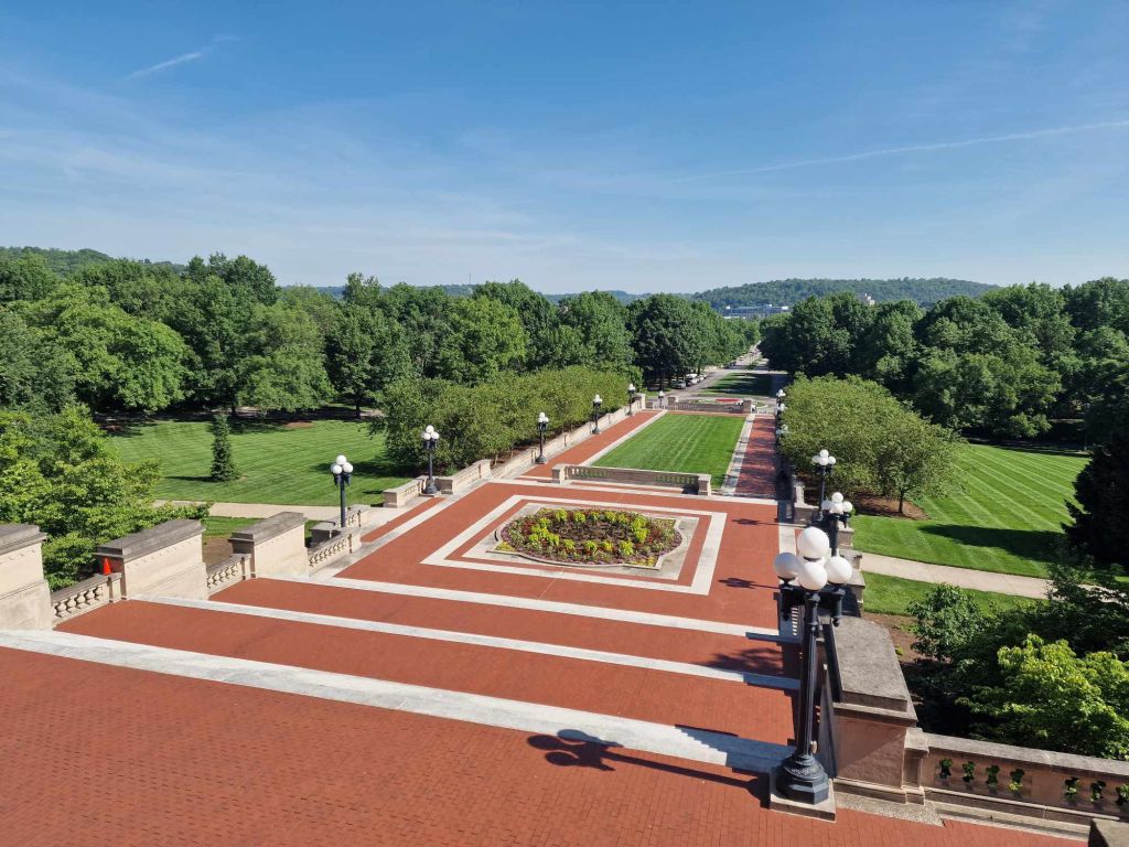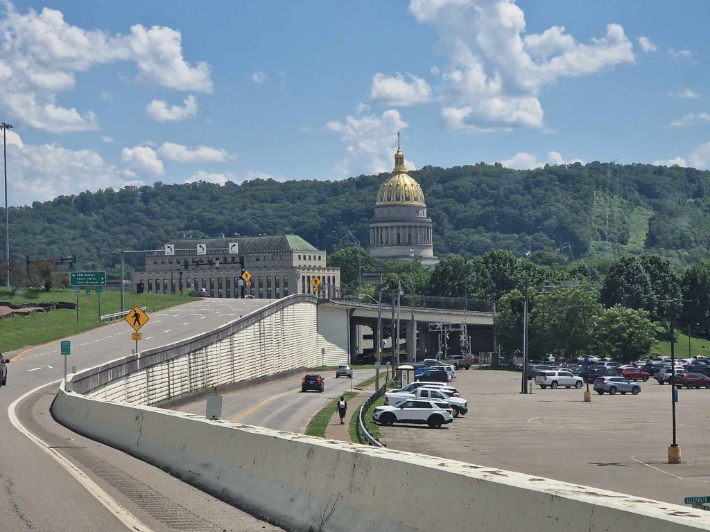 Αλλά προσπαθεί όμως φιλότιμα να ανταπεξέλθει, είναι η αλήθεια, γιατί έχει τα φόντα. Ποτάμι (ο γνωστός Kanawha River), πολύ πράσινο, σκιουράκια, λόφους καταπράσινος. Βέβαια, εδώ έχουν ανακαλύψει ένα ιδιαίτεροα περίεργο είδος διακόσμησης της πόλης. Παντού φτιάχνουν αυτοκινητόδρομους! Καθένας με τα βίτσια του.